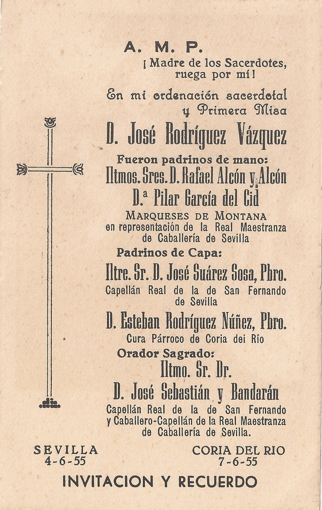 Importante acontecimiento tuvo lugar en Coria del Río el día 7 de junio de 1955, con motivo de la primera Misa del recién Ordenado Sacerdote D. José Rodríguez Vázquez, en la Parroquia de Santa María de la Estrella, de la que sería posteriormente Coadjutor.