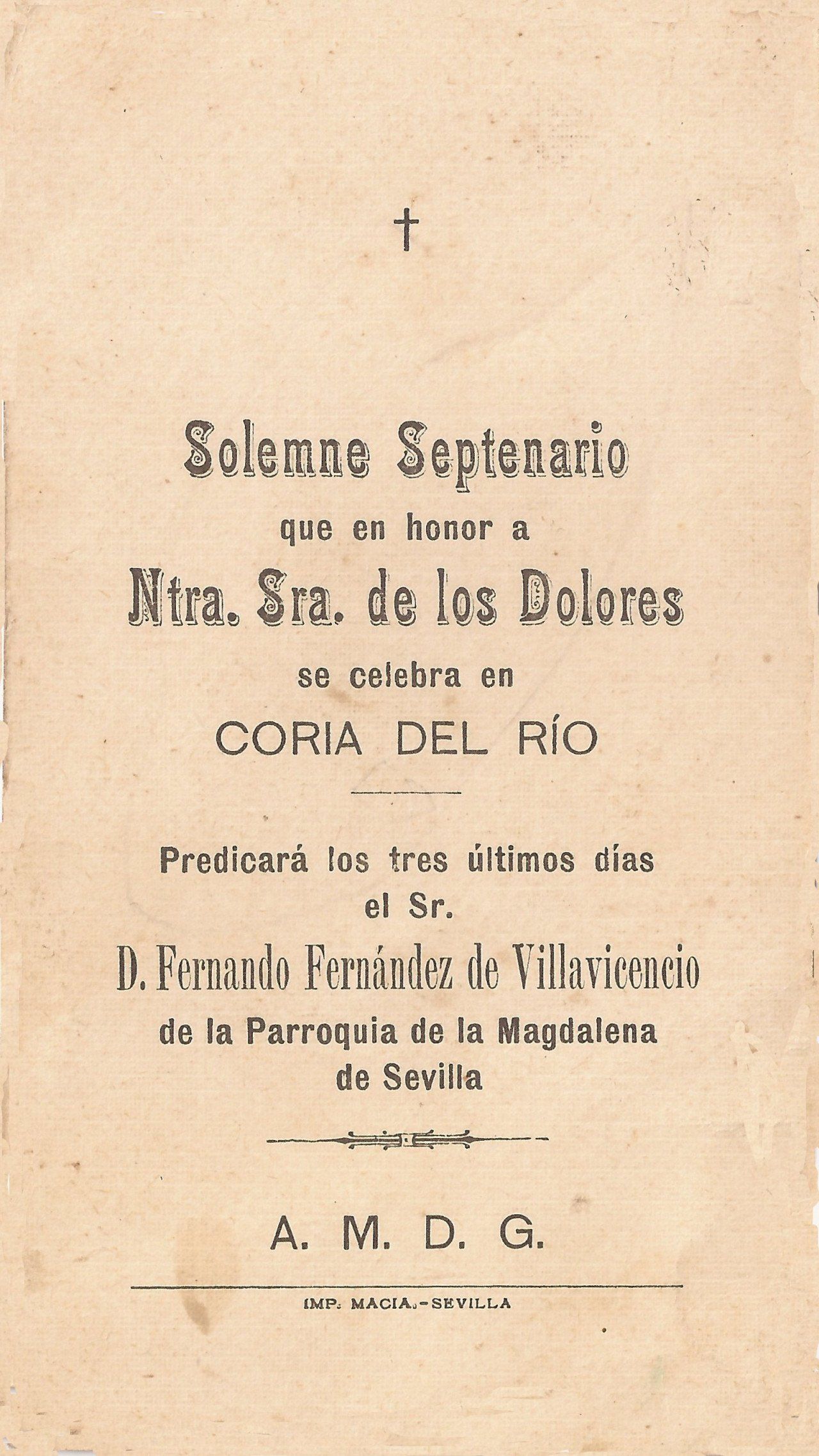 "El día 14 de mayo comenzó un solemne triduo en honor de Nuestra Señora del Rocío, bajo la augusta presencia de Jesús Sacramentado y costeado por don José Anastasio Martín, Hermano Mayor Perpetuo de esta Real Hermandad de Nuestra Señora del Rocío. Las tres noches estuvo nuestro templo concurridísimo, pero sobre todo la ultima en la que las amplias naves de esta Parroquia eran casi insuficientes para contener tantas personas de todas las clases sociales.